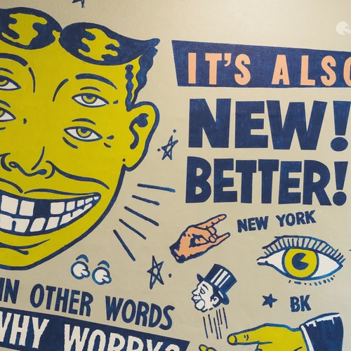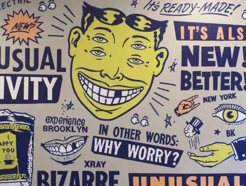 We Work Project- Artists Doug Cunningham and Jason Noto, co-founders of the creative branding and design studio Morning Breath, have made a name for themselves in the music, skateboarding, and snowboarding crowds with their big-name album covers, original art, and quirky murals. Here, they create an awesome design for us at WeWork Dumbo Heights.