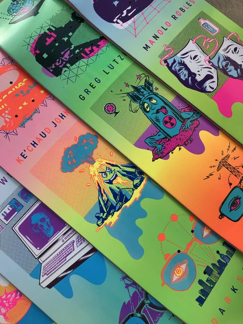Velocity Network Project-In Fall of 2015 Morning Breath was commissioned to create artwork to decorate and bring the office space of Velocity to life. Several dozen framed prints, A skateboard art installation, and Wall graphics for the elevator bay and office entrance were created. Using the brand properties of Viacom (the parent company) as inspiration, Morning Breath was able to transform the company's space into an exciting gallery space.
